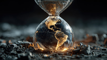 A captivating hourglass features Earth inside, illuminated by glowing continents. It symbolizes the passage of time and global transformation, inviting reflection.