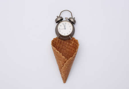 Ice cream waffle cone with alarm clock on white background. top view