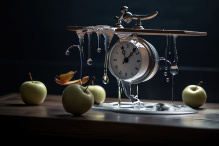 A clock sitting on top of a table next to apples. Generative AI image.