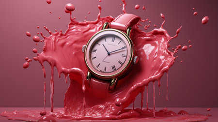 pink paint splash surrounds a clock watch on a painted surface, showcasing the artistic style of zbrush. this realistic hyperrealism piece features wet-on-wet blending techniques, with a color palette of red and bronze. the image tells a pictorial story, reminiscent of porcelain and editorial illustrations. ai generated