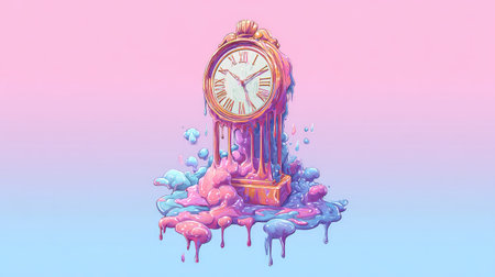 An illustrated antique clock is depicted in a surreal style, seemingly melting and flowing with colorful pastel elements. The artwork showcases a gold-colored clock with Roman numerals, set against a smooth gradient. This vibrant imagery may be suitable for creative design projects or editorial uses.
