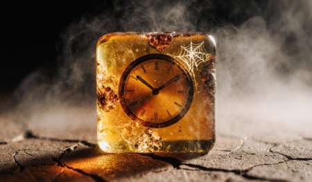 A unique clock trapped in amber sits on cracked earth, surrounded by mist and soft light. A delicate spider web clings to the amber, evoking a sense of stillness and mystery in the scene.