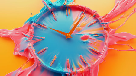 An image showcases a melting clock with vibrant, multicolored liquid flowing around it. The classic clock face contrasts with the dynamic, flowing texture. The composition likely represents the passage of time. This image has applications in design, advertising, or conceptual illustration.