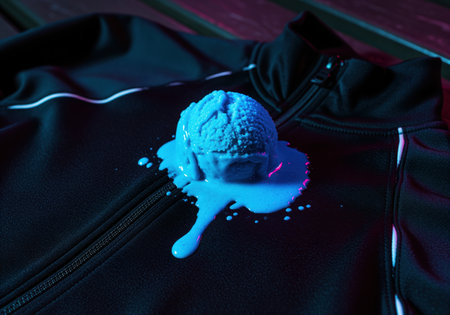 Vibrant blue sorbet scoop melting and smearing on a glossy black synthetic athletic jacket, highlighted by neon lighting. represents spills, easy cleaning, and modern style.