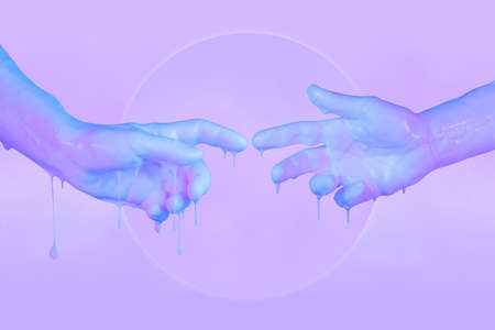 Human fingers dipped in color paint. Painted hands. Liquid drips off palms. Gesture. Contemporary art collage. Abstract surreal pop art style. Modern concept image. Zine culture. Funky minimalism.