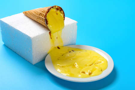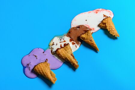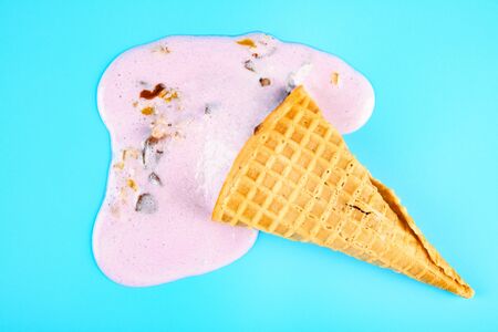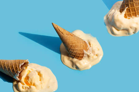 sweet potato flavor ice cream cone melts a lot on a blue backgroud