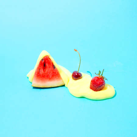 Watermelon, strawberry and cherry topped with yellow pudding. Summer composition on a blue background.