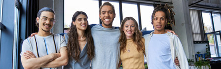 successful and stylish multiethnic colleagues looking at camera in modern office, horizontal banner