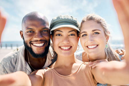Positive diverse taking friends selfie on sea beach portrait image, ai generated. Happy multiethnic tourists at seaside picture photorealistic photography. Inspiring journey concept photo realistic