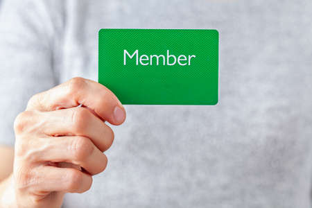 A young caucasian woman is holding a green card that says member on it. A customizable image which has space for text to be inserted. Being a member, membership dues, subscription, group concepts.