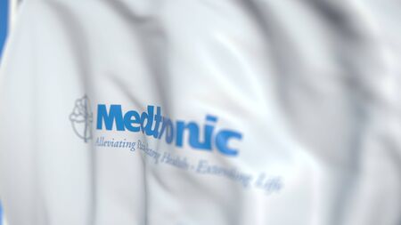 Waving flag with Medtronic logo, close-up. Editorial 3D rendering