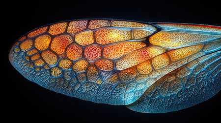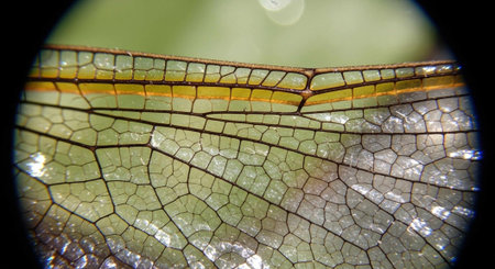 The wing of a dragonfly is shown in a close up. The wing is made of a thin, translucent material that is covered in tiny hairs. The wing is also covered in a pattern of veins that give it a delicate
