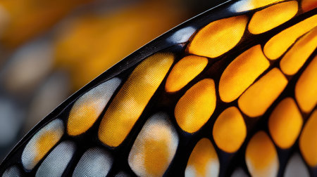 This stunning macro photograph captures the intricate details of a monarch butterfly wing, showcasing the vivid orange and black patterns. Perfect for nature enthusiasts.