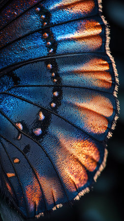 A stunning close-up of a butterfly's wing, revealing intricate details and vibrant colors. The image showcases the beauty of nature's artistry.