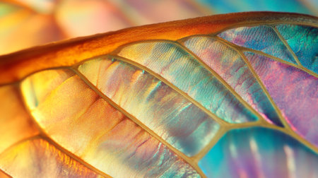 Rainbow-colored butterfly wing close-up, revealing intricate patterns and textures that evoke the beauty of stained glass