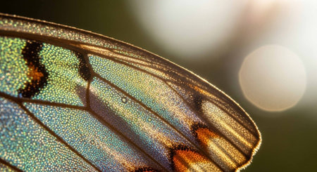 Detailed close-up of a butterfly wing showcasing vibrant colors and intricate patterns in natural light