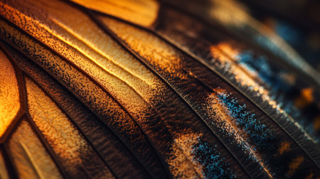 A stunning close-up shot showing the intricate details of an insect's wing. The golden light accentuates its beauty.