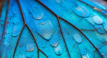 Blue and green butterfly wing close up with intricate scaling and vein pattern. Macro detail captures natures beauty and unique texture for scientific study.