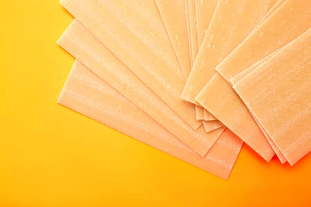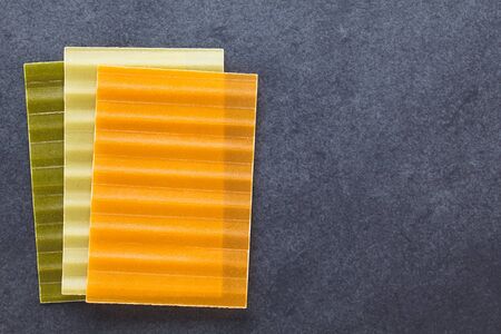 Raw tri color lasagne pasta sheets, photographed overhead on slate with copy space on the right side