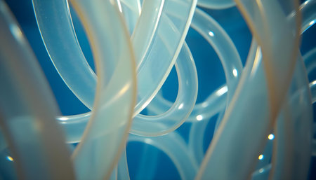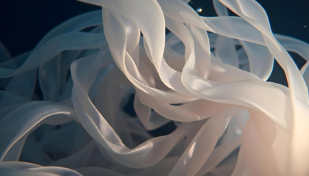 Subtle translucent effects and cool blue-green tonality evoke a sense of marine innovation in this meticulously crafted digital piece. Perfect for eco-friendly textile promotions, sustainable product mockups, beauty industry visuals, and scientific material presentations. The precise lighting accentuates surface qualities, offering high versatility for print and web ... AI-generated illustration.