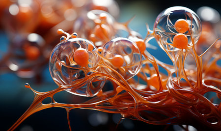 a vibrant 3d animation showcases a cell adorned with intricate embellishments. the cell is beautifully colored in light indigo and pink hues, reminiscent of a petzval 85mm f22 lens. the addition of light cyan and orange accents adds depth to the image. this captivating artwork resembles tilt-shift photography and resembles detailed miniatures found in medical imaging films. ai generated