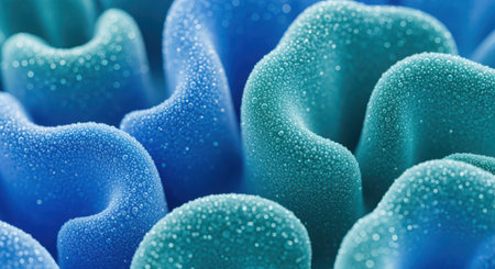 A detailed microscopic view reveals a vibrant abstract texture composed of undulating blue and teal organic structures. Small white particles are visible across the surfaces, highlighting the intricate details of this magnified biological or scientific specimen. The depth of field creates a sense of profound exploration into the minute world.