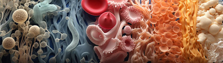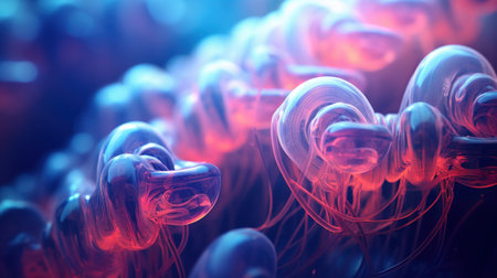 Abstract biology. Microscopy of colorful organic structures, microorganisms, cells. Microbiology concept. Generative AI.
