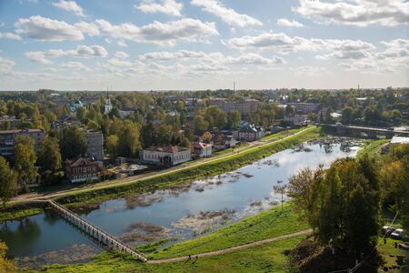 View from a great height to the center of the city of Pskov and the Velikaya River.