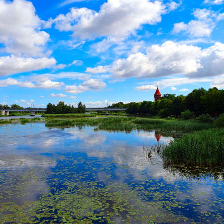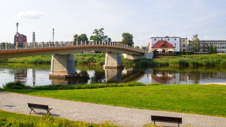 Konin, Poland - July 22, 2017: View on bridge and embankment of Warta river in polish town Konin, Greater Poland province