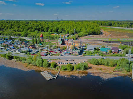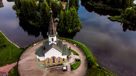 Nizino. russia. 18 july 2021. flight over the church of alexandra of rome in the lugovoy park of peterhof.