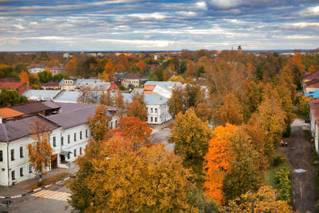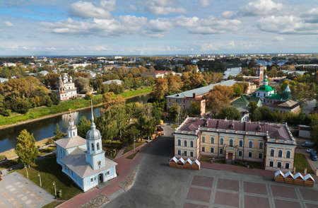 Beautiful urban landscape of Tver with view of embankment with old Russian buildings in autumn. Architecture of small town. Tver. Russia