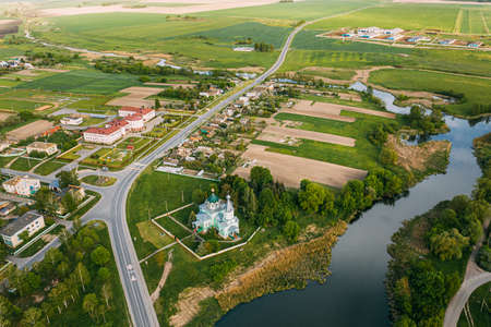 Rechytsa, Belarus. Aerial View Of Residential Houses, River Dnieper And Holy Assumption Cathedral In Sunny Summer Day. Top View. Drone View. Birds Eye View