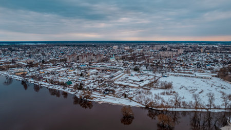 Aerial drone view of Spasskaya Church and Novotorzhsky Borisoglebsky Monastery with Tvertsa river in Torzhok, Russia. Russian winter landscape.