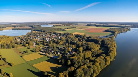 Generative AI : Aerial landscape of blue lake in green field top view of beautiful nature background from drone seasonal summer landscape with copy space