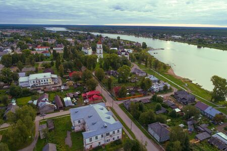 View of the historic center of the ancient northern city of Kargopol on a cloudy August morning (aerial photography). Arkhangelsk region, Russia