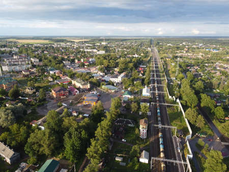 Volkhov city aerial vibrant view panorama, administrative center of Volkhovsky District in Leningrad Oblast, Russia, located on the river Volkhov, panoramic view summer sunny day
