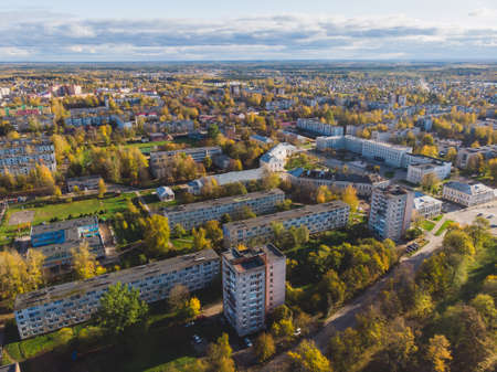 Lida, Belarus. Aerial Birds-eye View Of Cityscape Skyline. Lida residential area In Sunny Autumn Day