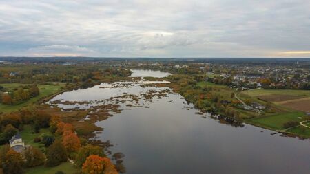 Doles Sala is the Second Largest Island in Latvia. This is a Peninsula in the Daugava River, Near the Borders of Riga. Aerial Dron Shoot. Sunny Autumn Day.