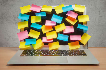 Laptop full display in reminders of colored stickers on table with gray wall. Many unfulfilled tasks, deadline
