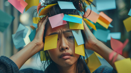 Stressed office worker surrounded by colorful sticky notes, symbolizing multitasking, time management challenges, and work related chaos. Hands on head in frustration, expressing stress and urgency