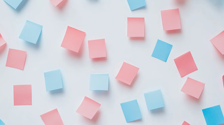A vibrant arrangement of colorful sticky notes in blue and pink on a bright background, perfect for concepts of creativity, organization, and planning.
