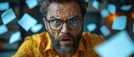 Stressed professional surrounded by colorful sticky notes, symbolizing multitasking and time management challenges. The chaotic scene highlights the pressure of deadlines and work stress