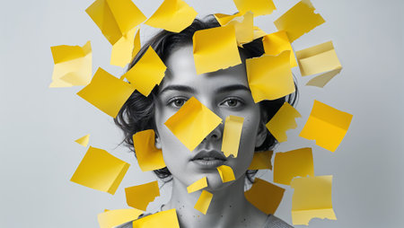 Black and white portrait of a young woman with yellow sticky notes flying around her head, symbolizing thoughts, ideas, and memories. Ai generated image