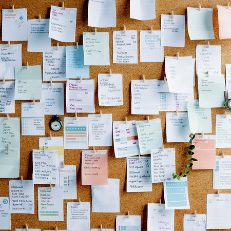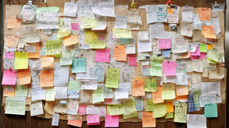 Sticky notes board in office. Many different colorful paper stickers pinned on wall. Memory notes for business planning. Created with Generative AI