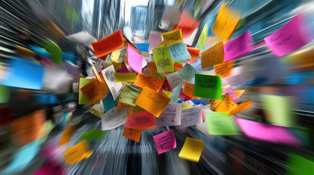 Busy office environment with colorful sticky notes flying through the air. Workers are focused on tasks amidst the chaos, highlighting themes of multitasking and time management stress