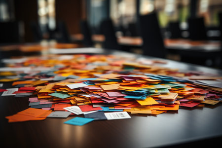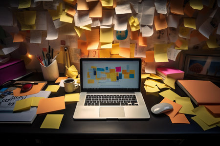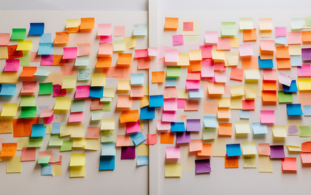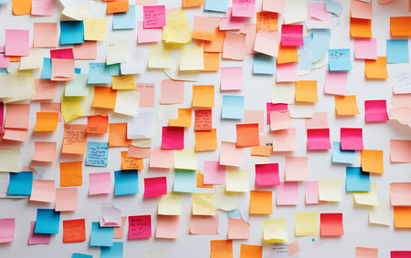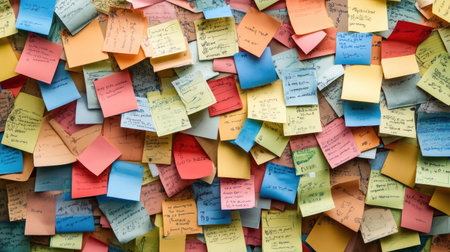 Chaotic arrangement of colorful sticky notes covers a surface, symbolizing the stress and complexity of multitasking, time management, and meeting deadlines in a fast paced work environment