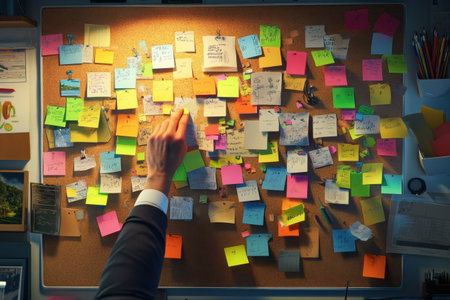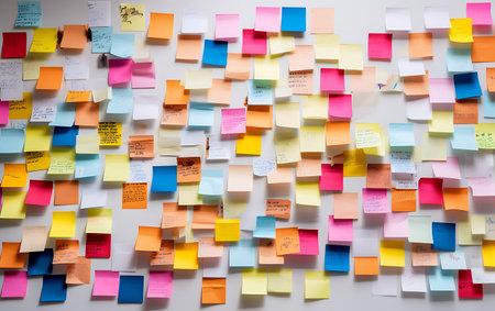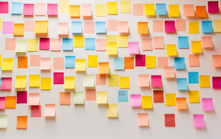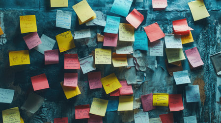 A vibrant arrangement of sticky notes with various colors and handwritten notes fills a surface. This image captures the essence of creativity and organization in any workspace.