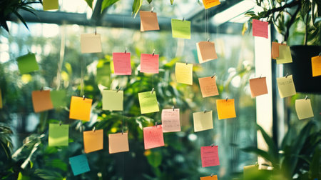 A vibrant arrangement of colorful sticky notes suspended in an indoor garden setting, representing creativity and organization for ideas and reminders in a lively workspace.