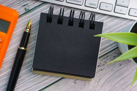 Flat lay and Business Concept. Fountain pen, keyboard, decorative plant, calculator and notepad on wooden background. Copy space