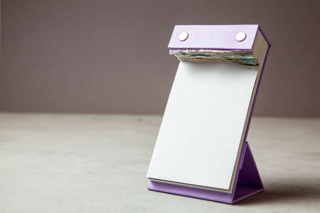 Mock-up tear-off calendar is on the table on gray background. Copy space for text.